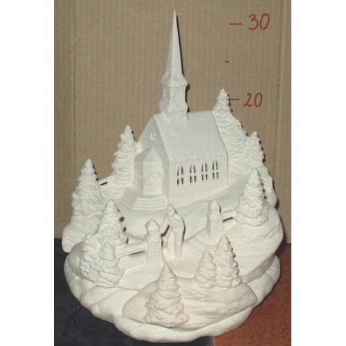 Réf. 01-120 église en hiver et sapins, groupe de figurines, h 32 ; biscuits de faïence fine (céramique brute à peindre ou à émailler)
