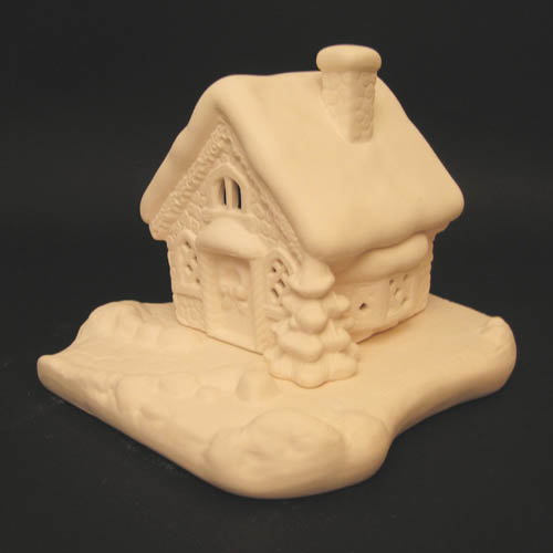 Réf. 01-104-1 maisonnette décorée sur socle, groupe de deux figurines / photophore, L 21 x l 19,5 x h 16,5 ; biscuits de faïence fine (céramique brute à peindre ou à émailler)