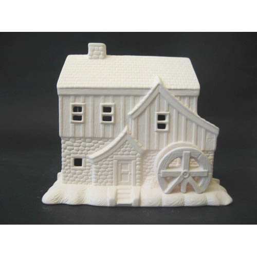 Réf. 13-159 moulin à eau, figurine / photophore, L 15 x l 11,5 x h 13,5 (avec une roue mobile) ; biscuits de faïence fine (céramique brute à peindre ou à émailler)