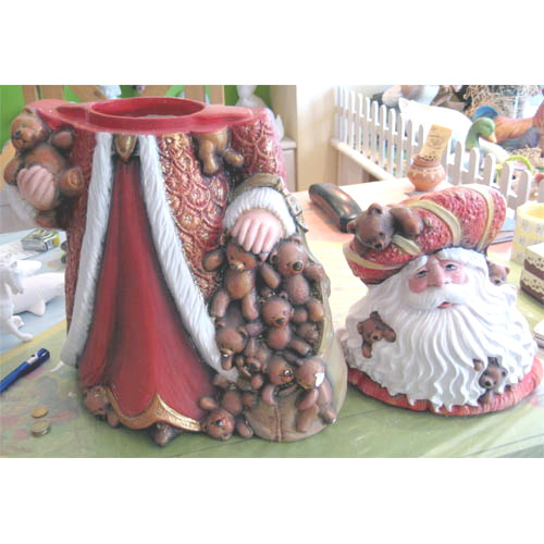 Réf. 01-021b Père Noël avec oursons, figurine très GM / boîte peinte ouverte, h 58