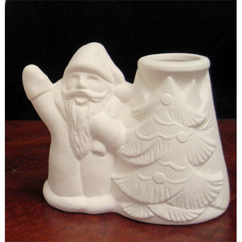 Réf. N°133 Père Noël avec sapin, vase à fleurs séchées / bougeoir / porte-crayons, L 9 x l 5,5 x h 8 ; biscuit de faïence fine (céramique brute à peindre ou à émailler)