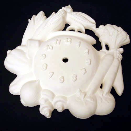 Réf. 12-028 légumes, cadran de pendule, L 27 x l 30,5 x h 4 ; biscuit de faïence fine (céramique brute à peindre ou à émailler)