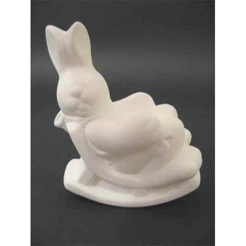 Réf. N°123 lapin sur chaise à bascule, coquetier, L 9,5 x l 6 x h 11 ; biscuit de faïence fine (céramique brute à peindre ou à émailler)