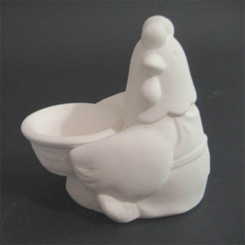 Réf. N°140 poule avec panier, coquetier, L 9,5 x l 6,3 x h 9 ; biscuit de faïence fine (céramique brute à peindre ou à émailler)