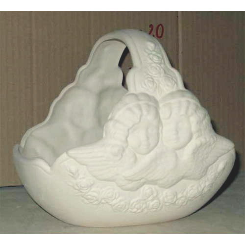 Réf. 14-065 corbeille décorée de têtes d'anges, L 20 x h 20 ; biscuit de faïence fine (céramique brute à peindre ou à émailler)