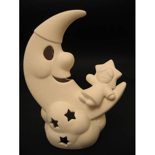 Réf. N°136 Lune et étoile, figurine / photophore, L 13 x l 8 x h 20 ; biscuit de faïence fine (céramique brute à peindre ou à émailler)