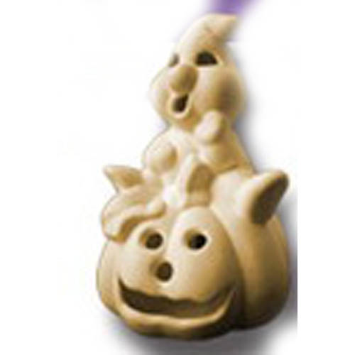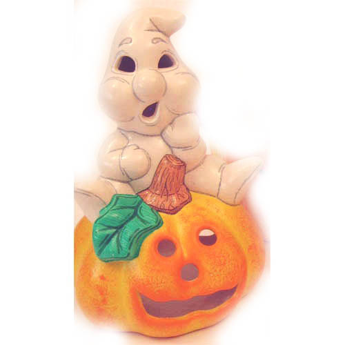 Réf. N°172 fantôme sur citrouille, figurine / photophore, 10 x 10 ; biscuit de faïence fine (céramique brute à peindre ou à émailler)