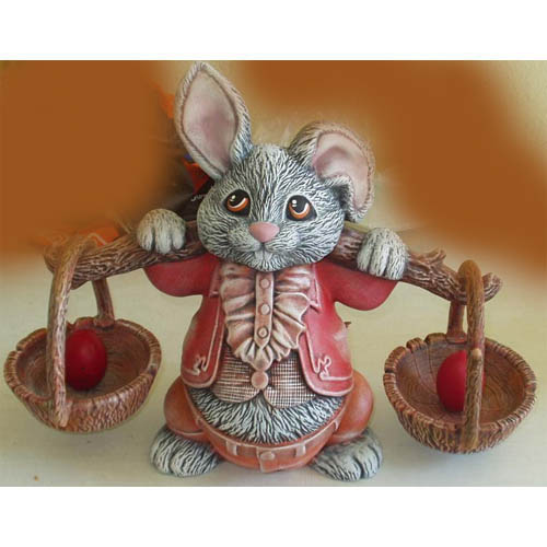 Réf. 05-005b-2 lapin avec corbeilles, groupe de trois figurines peintes, L 45 x l 25 x h 34