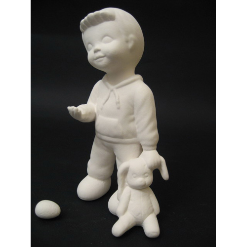 Réf. 05-045 garçon avec lapin et oeuf, groupe de deux figurines (option n°1), L 9 x l 7 x h 17 ; biscuits de faïence fine (céramique brute à peindre ou à émailler)