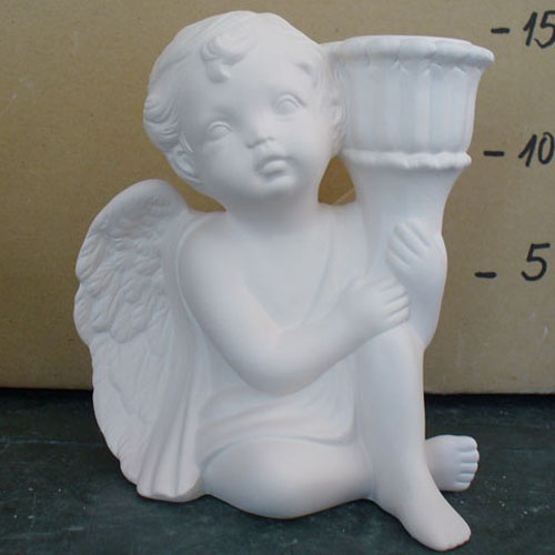 Réf. 14-091-3 ange avec cadeau, figurine, L 6,4 x l 4,4 x h 8 ; biscuit de faïence fine (céramique brute à peindre ou à émailler)