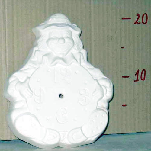 Réf. 16-011 clown, cadran de pendule, L 17 x h 21 ; biscuit de faïence fine (céramique brute à peindre ou à émailler)