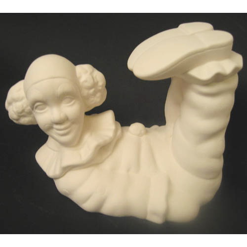 Réf. 16-009 clown couché, figurine MM, L 16 x l 11,5 x h 12,5 ; biscuit de faïence fine (céramique brute à peindre ou à émailler)