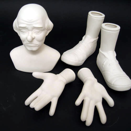 Réf. 16-012-1 clown pour bâtons, groupe de cinq figurines (on fait le corps avec des bâtons et on met au-dessus des vêtements), L 14 x l 11 x h 17,5 (buste), L 14,5 x l 9,5 x h 6 (main dr.), L 15 x l 10 x h 4 (main g.), L 14,5 x l 6,5 x h 12,5 (chaque pied) ; biscuits de faïence fine (céramique brute à peindre ou à émailler)
