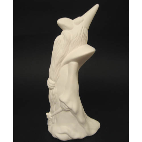 Réf. N°180 sorcière sur balai, figurine, L 23 x l 11,5 x h 14,5 ; biscuit de faïence fine (céramique brute à peindre ou à émailler)
