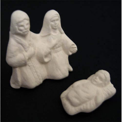 Réf. 01-012 la Sainte famille, groupe de figurines (détail : personnages), L 13,5 x l 9,5 x h 15 ; biscuit de faïence fine (céramique brute à peindre ou à émailler)