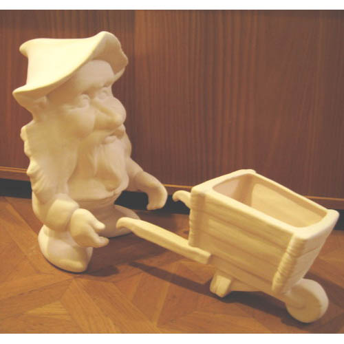 Réf. 02-012 troll avec brouette, groupe de deux figurines / cache-pot, troll L 22 x l 21 x h 36 ; brouette L 32 x l 19 x h 17 ; biscuits de faïence fine (céramique brute à peindre ou à émailler)
