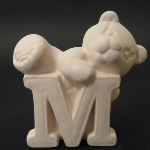 Réf. 04-006-10 ourson en peluche lettre « M », figurine, biscuit en faïence fine (céramique brute), L 8,5 x l 5 x h 8,2