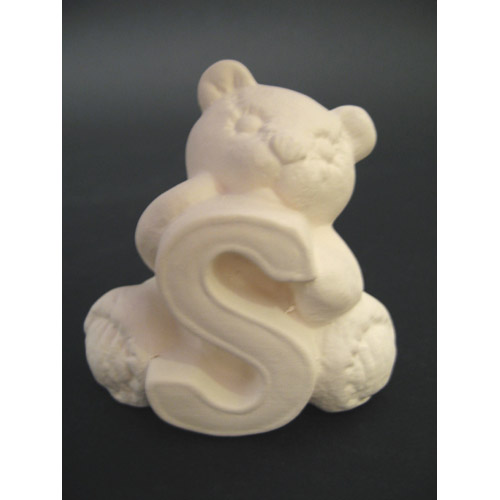 Réf. 04-006-15 ourson en peluche lettre « S », figurine, biscuit en faïence fine (céramique brute), L 7,3 x l 5,2 x h 6,7