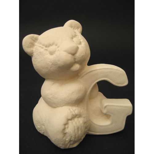 Réf. 04-006-5 ourson en peluche lettre « G », L 7 x l 5,5 x h 7,5 ; biscuit de faïence fine (céramique brute à peindre ou à émailler)
